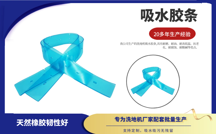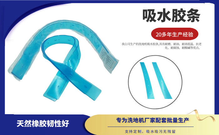 產品說明:吸水膠條是洗地機吸水扒上的重要部件,作用就是與地面接觸,產生一個密封的空間,把地面上的污水通過風機進行回收。吸水膠條一般分為耐油型(進口PU原料)和普通型(進口NR原料)兩種。